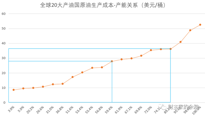 不过,这里我不关心各国不同来源的原油产量,而是简单根据这20个国家的原油产量和原油生产成本,做出了生产成本-产能曲线。