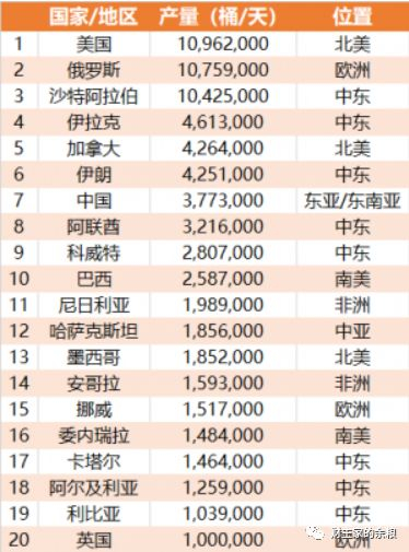2018年全球有20个国家的原油产量超过了100万桶/天,其中美国、俄罗斯和沙特是大户,原油产量都超过了1000万桶/天;
