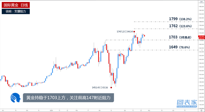 图为黄金日线走势图,金价持续交投于3月高点1703上方,这或暗示金价上涨势头强劲,若价格继续走高,近期或测试前高1747与斐波那契123.6%延展位1762组成的阻力区间,突破后或将进一步看涨至斐波那契138.2%延展位1799附近。