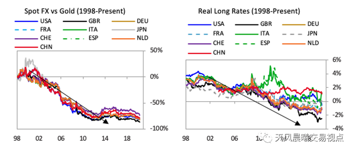 自2000年以来,以黄金衡量,我们看到以货币的总回报出现了更渐进、更有序的下降,与这几十年来各国实际利率普遍下降的趋势一致。