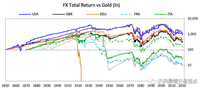 下图显示了1600年以来三大储备货币相对于黄金的即期汇率回报率。虽然我们将在文章中对这些进行深入研究,但目前我希望您关注即期汇率回报率和自1850年以来的所有主要货币的生息现金的总收益。