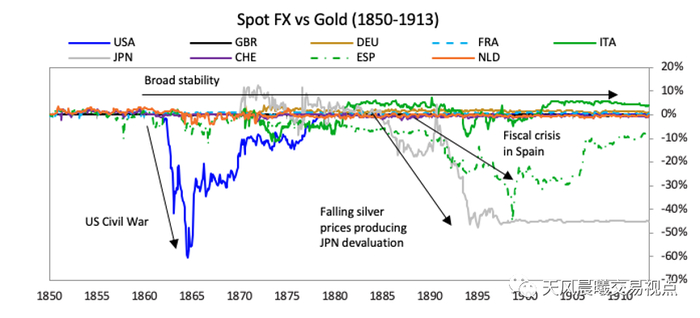 在19世纪70年代中期,美国恢复了之前的金本位制度后,许多其他国家也加入了金本位制;直到第一次世界大战之前,大多数货币对黄金的汇率都是固定不变的。主要的例外是日本(在19世纪90年代之前一直采用银本位制,这导致其汇率对黄金贬值,因为在此期间银价下跌),意大利和西班牙,这两个国家经常暂停本国货币与黄金的兑换,以解决巨额财政赤字问题。