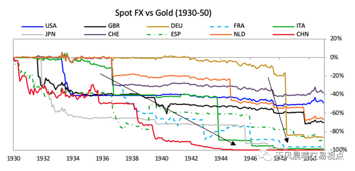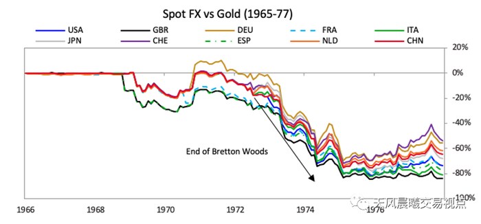 在我们所研究的主要案例中,所有经济体都经历了一种典型的“挤兑”动态,因为对央行发行的货币的索取权数量,高于能够满足索取权要求的硬通货(通胀是黄金)的数量。美元是英国储备货币贬值的原因,因为当时英镑与美元挂钩。