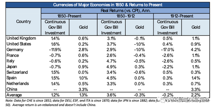 1912年(现代法定货币时代)以来,持有短期国债的实际回报率(经过通胀调整的)为-0.2%,持有黄金的实际回报率为2.2%。在此期间,你只有在大约一半的国家持有生息现金货币才能获得正的实际回报,在其余的国家则会遭受损失(在法国、意大利和日本,每年损失超过2%,在德国,由于恶性通货膨胀,每年损失超过15%)。