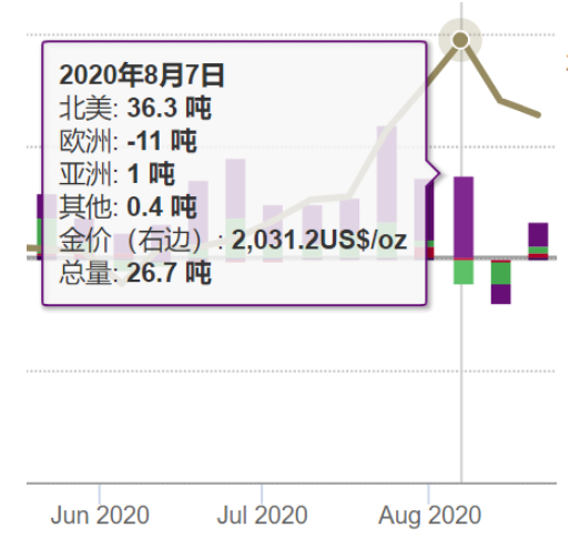 注:4月初北美增持32吨,而亚洲地区仅1.2吨;8月初北美增持36.3吨,亚洲仅增持1吨。
