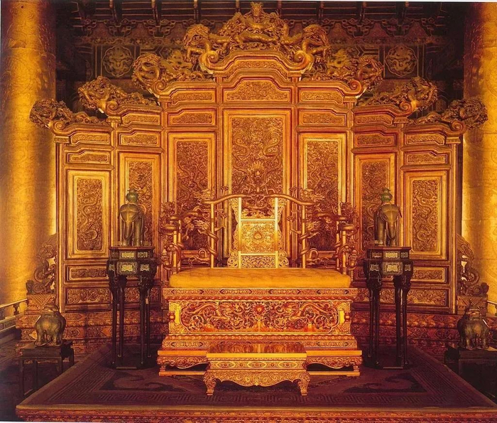 讲完了关于龙椅的传奇经历,咱再说几句关于龙椅本身的东西。这金光耀眼耀眼的宝座是啥做的,纯金的么?当然不是。关于这个宝座有个比较学术的名称叫做:髹金雕龙木椅。得,您看这名字,立马就明白了,木头做的,是不是顿时心凉了半截。但您可要知道这木头可不是一般的木头,是紫檀的。光是木材的价格就已经超过了黄金。而这髹金又是什么意思呢,通俗一点就是漆上黄金做成的漆,至于具体过程肯定没有在木头上刷油漆那么简单就是了。
