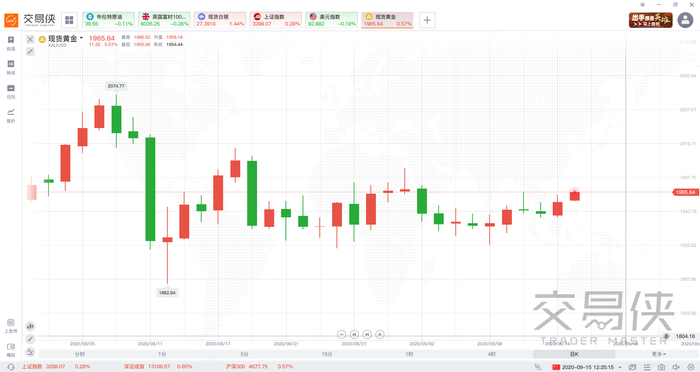 自金价在8月6日创下历史最高纪录2074美元/盎司以来,金价一直在横向波动直至走低。过去五周,黄金一直处于高位盘整。