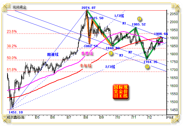这幅金价日K线图表,我们近期时常分析。图中可以看出,在2020年8月金价见顶2074.87美元之后,金价总体运行在标准的H1H2中期调整通道中,目前金价正受到中期下行趋势线H1线、季度线、半年线,甚至2020年牛市波段(1451.10-2074.87美元)阻速线2/3线等综合市场作用力,主要体现为反压。