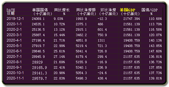 国债数据,2020年1-11月,美国国债总市值由24.0691万亿美元,增加至29.5797万亿美元,2020年1-11月国债净增5.5106万亿美元。