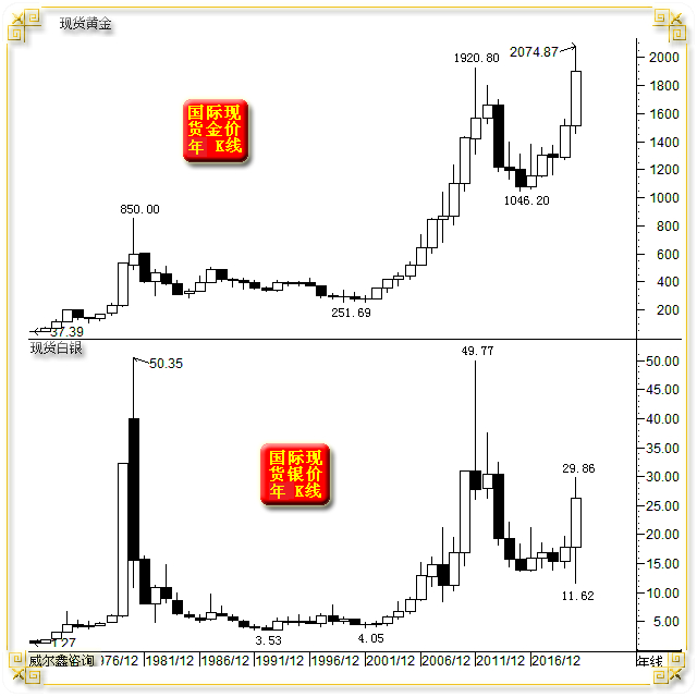 2020年,国际现货金价以1517.70美元开盘,受疫情打压后最低下探1451.10美元。而后受避险情绪推动,掀翻2011年历史大顶,最高上试2074.87美元,报收1897.88美元。全年上涨380.70美元,涨幅25.09%。