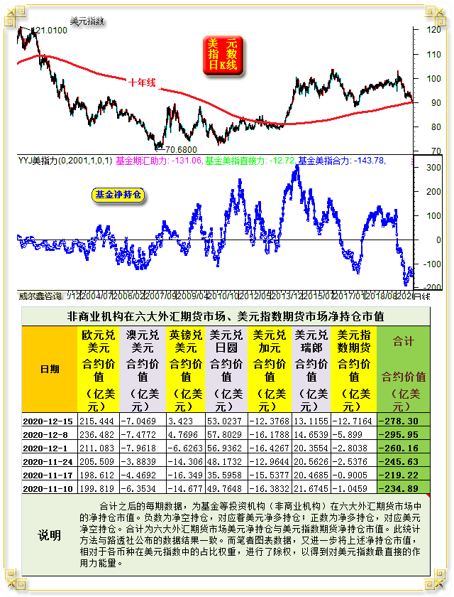 对冲基金做空美元的名义能量峰值为2020年8月下旬的344.1964亿美元。也即此后对冲基金做空美元指数的净能量与美元指数运行形态,呈底背离现象。下图体现更清晰:
