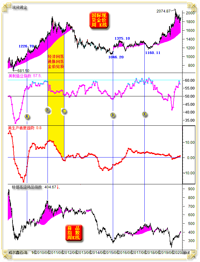 参考上述50年黄金市场运行历史,进一步细化分析2008年金融危机见底后的十几年黄金市场,如金价周K线,以及对应的美国经济活力指数(以ISM制造业指数为参照)、生产者物价指数(PPI)、标普高盛商品指数图示: