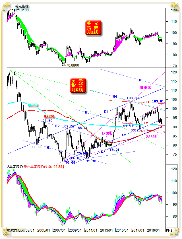 三角形底边H2线,对数十年美元指数宏观底部的有效性指示极其明显。