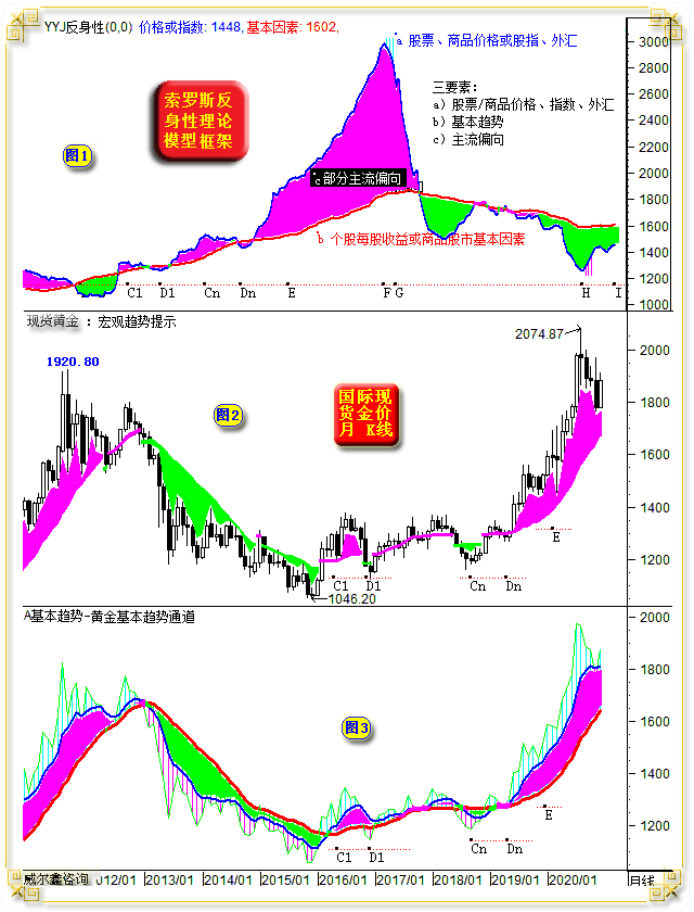 具体到黄金市场,图中2、图3是笔者参考索罗斯反身性理论模型为金市定义的“趋势框架”: