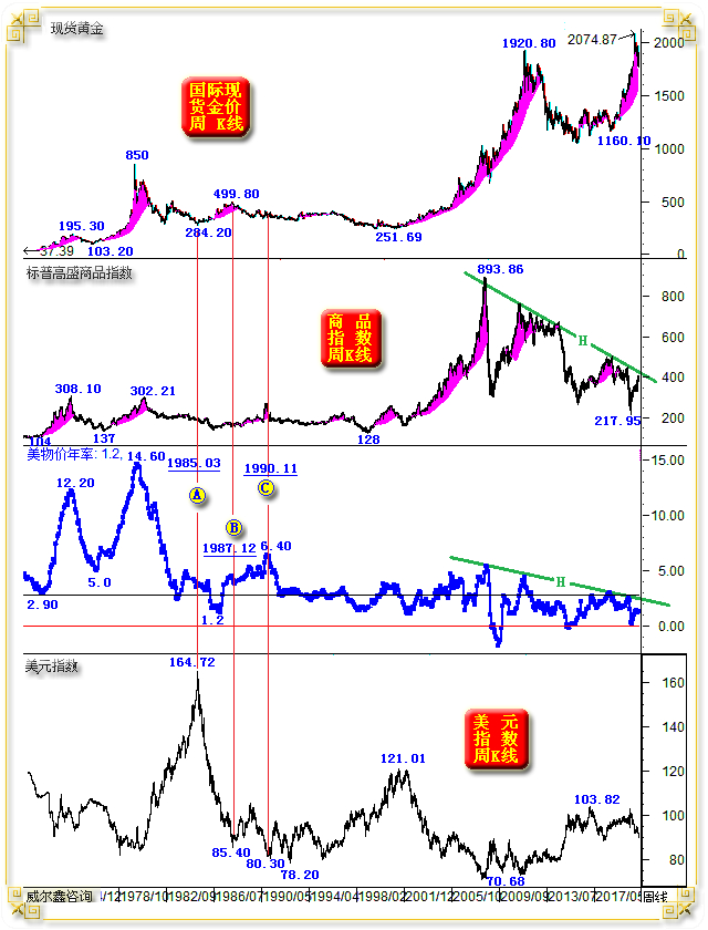 观2018年黄金牛市开启后至今的商品指数、物价指数运行趋势,总体背离黄金牛市而下行,这与1985-1987年AB区间情形相似。如果中期物价指数、商品指数,仍因经济复苏不力,缺乏上行配合,那么黄金市场牛市能否持续,定然存疑。