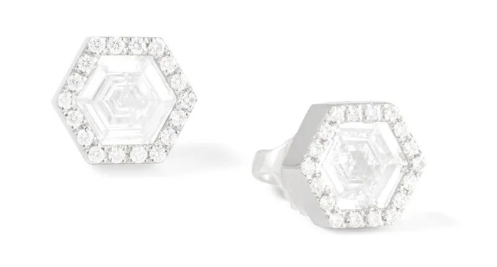 当天,她佩戴了由美国珠宝设计师Monique Pean设计的铂金钻石耳钉,白色的六边形切割主钻石,辅以碎钻镶边,采用回收铂金,致力于展现环境和社会可持续发展的象征性意义。