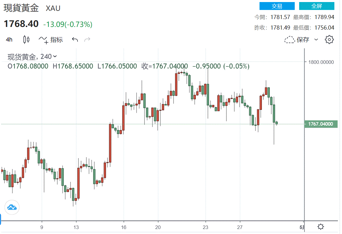 FX168财经报社(北美)讯 周四(4月29日),受美国经济数据利好推动,美国国债收益率大涨,金价周四下跌0.7%,目前报1768.4美元/盎司。