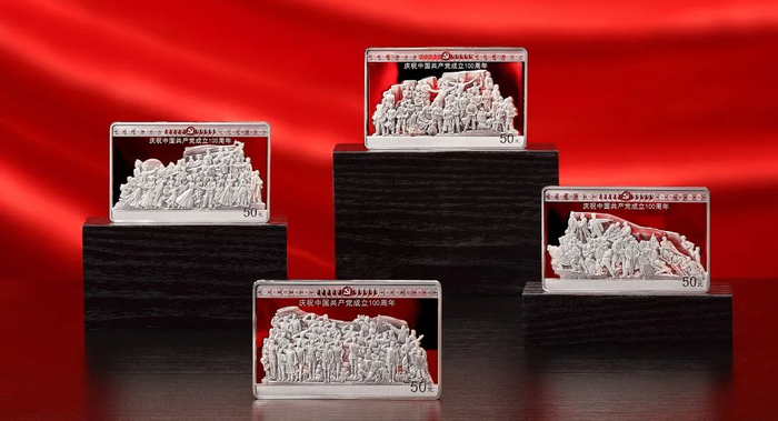 4枚150克长方形银币背面图案采用中国共产党历史展览馆四组大型群雕《信仰》《伟业》《攻坚》《追梦》,分别表现了中国共产党在统揽伟大斗争、伟大工程、伟大事业、伟大梦想的历史进程中,不断夺取新时代中国特色社会主义新胜利的主题。