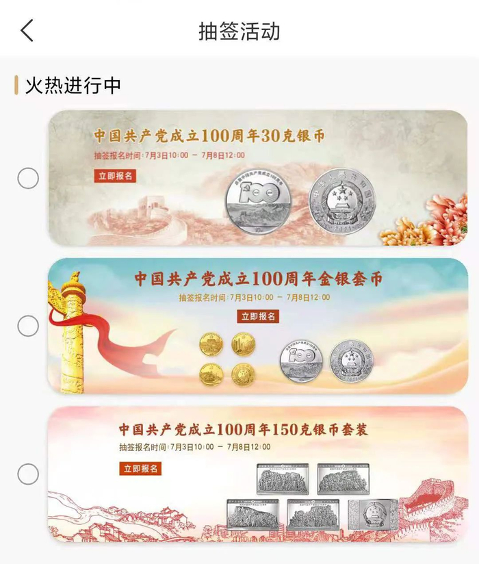 金币云商于7月3日-7月8日通过APP开展了建党百年金银币首批抽签报名活动。