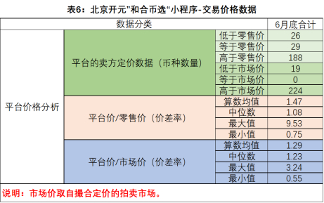 如表5和表6所示,截止6月30日:①这个平台共计上线243个币种,实现交易的币种181种,占上线币种总数的74.49%。在实现交易的币种中,共计成交3944枚,成交总金额336.27万元(这个成交总额按系统显示的成交量计算,它与实际成交状况是否存在差异,无法获知)。②从平台销售的热度看,上线初期交易量相对较大,6月16日至30日,交易规模迅速下降。③数据显示,与市场价相比,目前平台的卖方定价总体偏高。