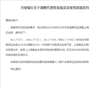 兴业银行关于调整代理贵金属买卖业务延期合约个人客户交易保证金率的公告:Au(T+D)、mAu(T+D)、Au(T+N1)和Au(T+N2)合约的交易保证金率从16.5%调整为17%,Ag(T+D)合约的交易保证金率从20.5%调整为21%;机构客户交易保证金率不变,上海黄金交易所席位保证金率、涨跌停板比例均未变。