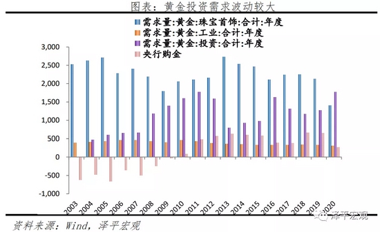 整体而言,金饰需求和工业需求整体波动不大,两者合计占比约为50-60%,决定了黄金的总需求水平和黄金价格的中枢水平。短期来看,投资需求波动较大,决定黄金短期价格,长期来看,官方储备需求是长期黄金需求上涨的主要推动力,决定黄金长期价格走势。