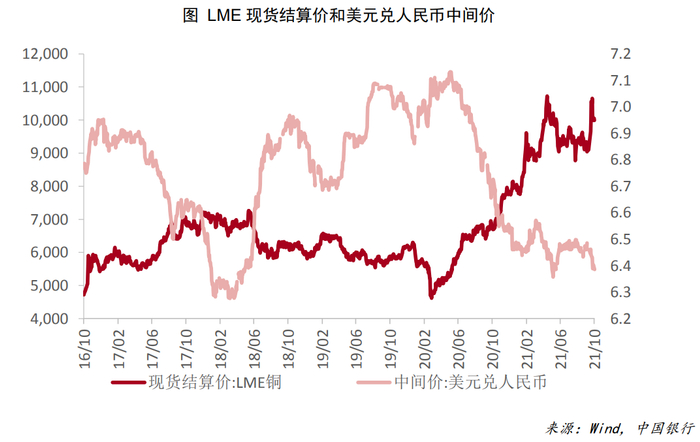 我们观察看到,过去5年铜价与USDCNY汇率呈现出较强的负相关性,并且可以用来探寻黄金境内外价差波动的趋势。从经济角度来理解的话,一方面,作为宏观经济的晴雨表,铜的价格上涨通常预示着经济复苏预期的增强,有利于带动风险资产,相对利空避险资产黄金。而境外黄金价格波动常常领先于境内金价,从而可能导致价差扩大。2021年以来,伴随着疫情后全球经济复苏的预期,国际大宗商品普遍供不应求,叠加金融投机的因素,导致价格大幅上涨,原油、铁矿石,多个基本金属价格均创下近年来新高,黄金境内外价差也从2020年的深度贴水中得到修复。另一方面,近期人民币汇率的升值行情可以在一定程度上对冲铜价上涨,降低境内生产加工企业的进口成本,从而缓解输入性通胀的压力。同理,人民币汇率的升值在一定程度上利好黄金境内外价差,因为境外黄金折成以人民币计价后变得更便宜了,这一点可以在2021年以来的价差走势得到印证。