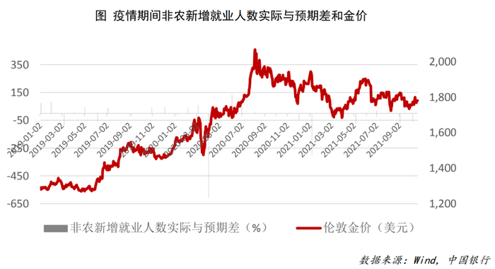 疫情期间非农数据经常与预期出入较大,故对黄金的短期波动有较大的影响。中期来看,进入2022年,预计疫情将持续好转,非农就业人数预期与实际数据偏差收敛,美元走强,致使金价走弱。非农就业人数成为客观反映当下经济形势复苏的印证。美联储官员在最新的表态中已经阐明其首要政策目标是达到充分就业,如果就业市场稳定保持高速增长,那就意味着经济情况已经达到了加息的门槛。