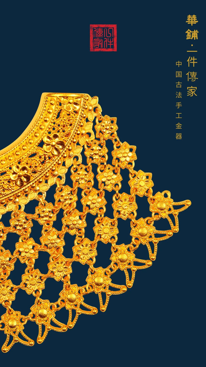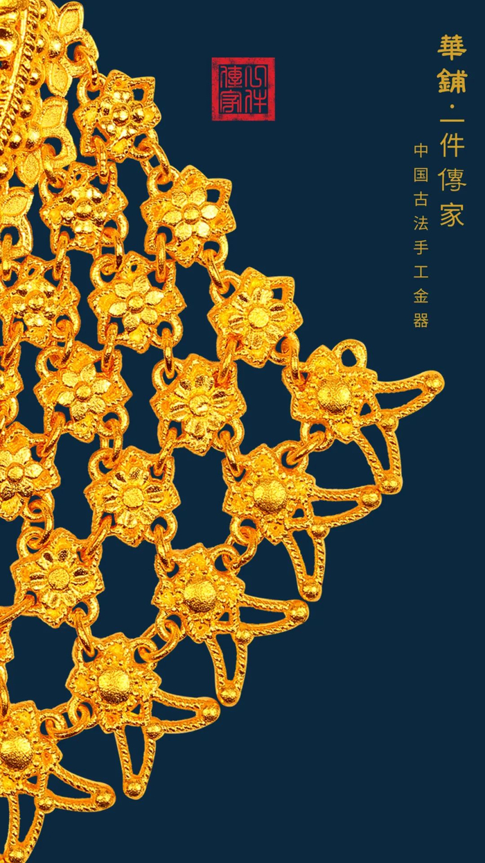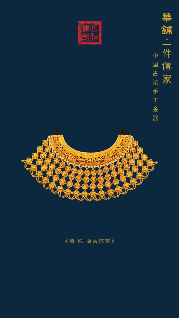 华铺黄金·福、禄、夀、禧、祥、瑞系列产品之禧系列——《禧·悦 凝香梳帘》,以宋·花卉镂空金梳帘为原型,采用锤揲、花丝、錾刻、镂空等古法手工制金工艺,再现流行于宋代的金梳帘。