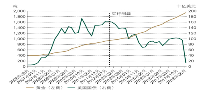俄罗斯的黄金储备和美国国债的持有量变化 数据来源:世界黄金协会、美国财政部
