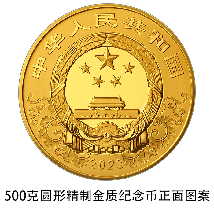 500克圆形金质纪念币为精制币,含纯金500克,直径80毫米,面额5000元,成色99.9%,最大发行量500枚。
