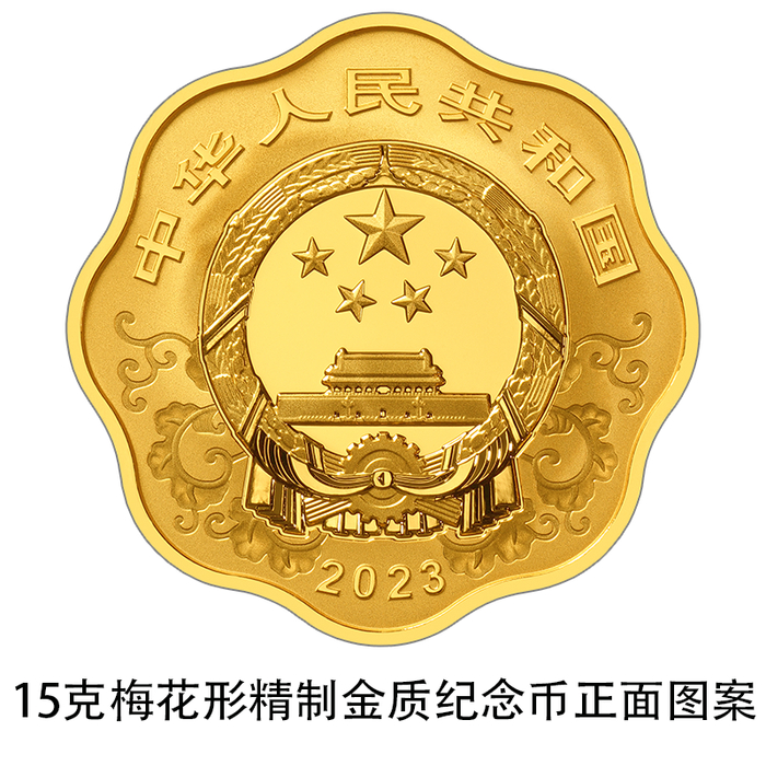 15克梅花形金质纪念币为精制币,含纯金15克,外接圆直径27毫米,面额200元,成色99.9%,最大发行量6000枚。