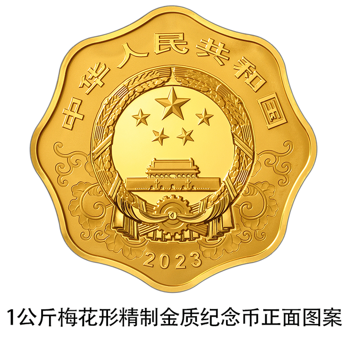 1公斤梅花形金质纪念币为精制币,含纯金1公斤,外接圆直径100毫米,面额10000元,成色99.9%,最大发行量118枚。