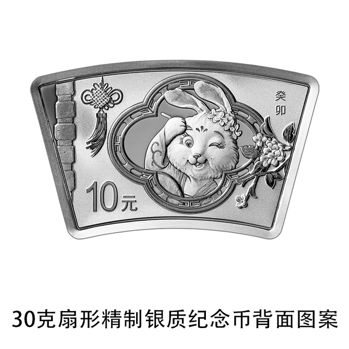 150克长方形银质纪念币及30克扇形银质纪念币背面图案均为卡通兔造型,衬以桂花、中国结、窗等组合设计。