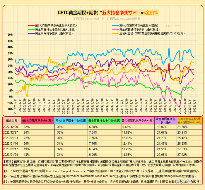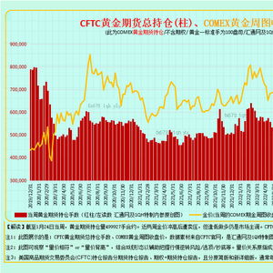 汇通财经APP讯——独家最全面的CFTC黄金持仓报告,12张图看透黄金现货商及黄金资本管理机构的投机持仓。本文含CFTC黄金期货持仓报告、CFTC黄金期货+期权持仓报告,共12张图展示金价与这些持仓数据的变化。数据素材来自CFTC官网,为汇通网及1QH特制内参。截至1月24日当周,黄金期货持仓量499927手合约。近两周金价冲高后遭卖压,CFTC黄金期货持仓量仍走高;量价信号不一致。更多详细内容详见本文图表(淡蓝色底色展示CFTC黄金期货持仓数据,黄底色展示CFTC黄金期货+期权持仓数据)。