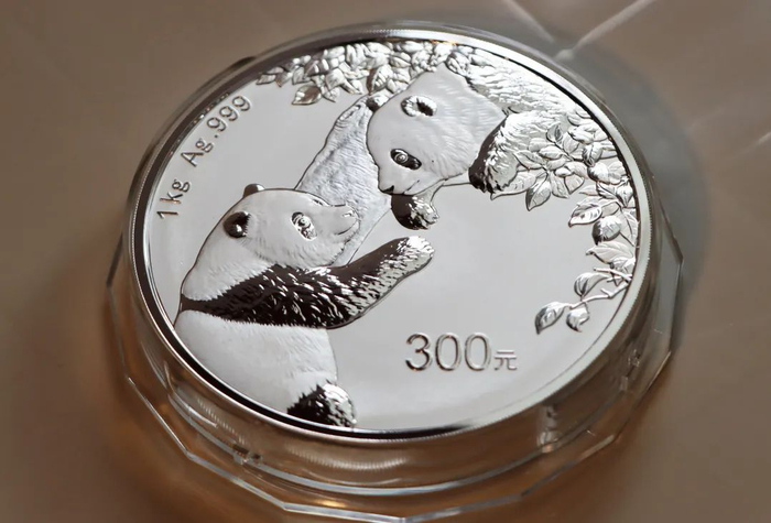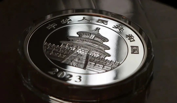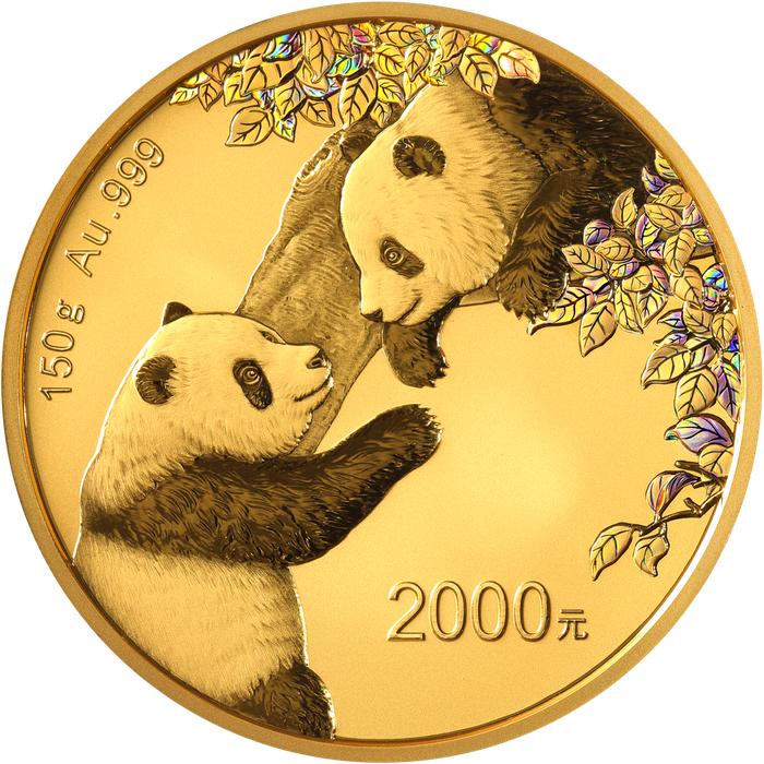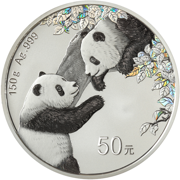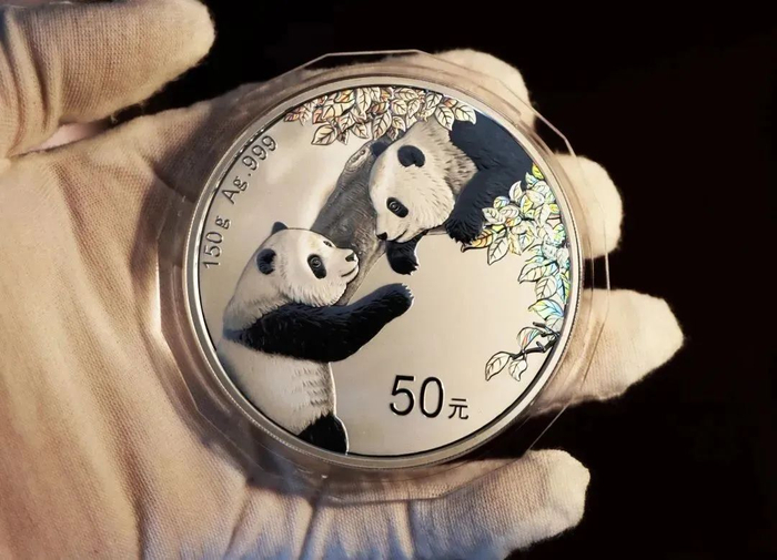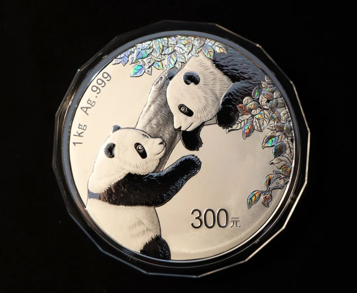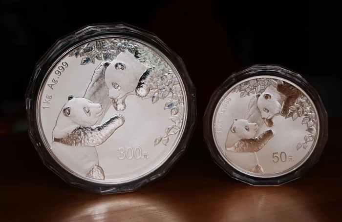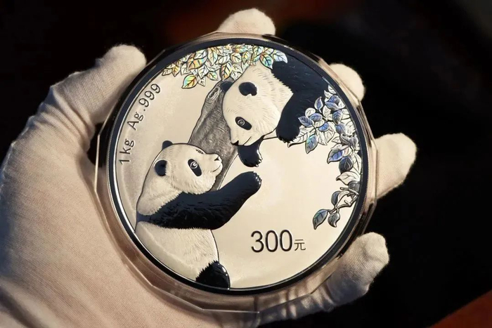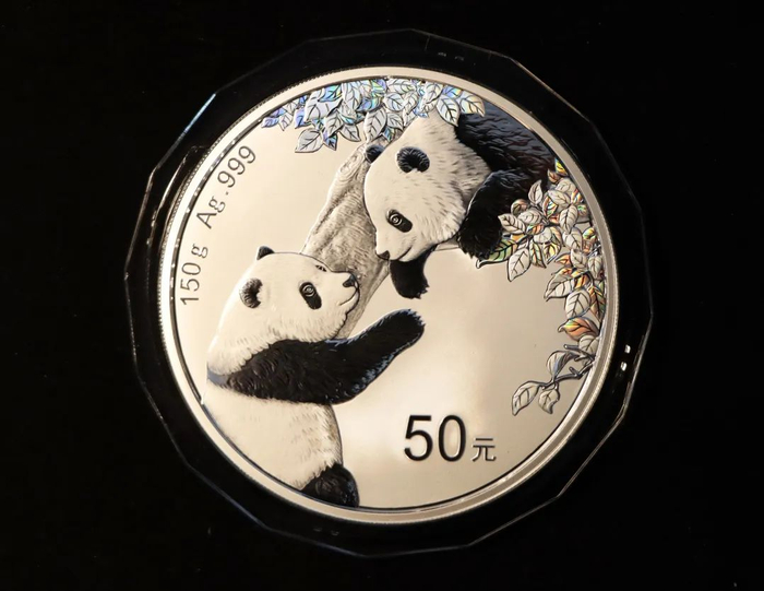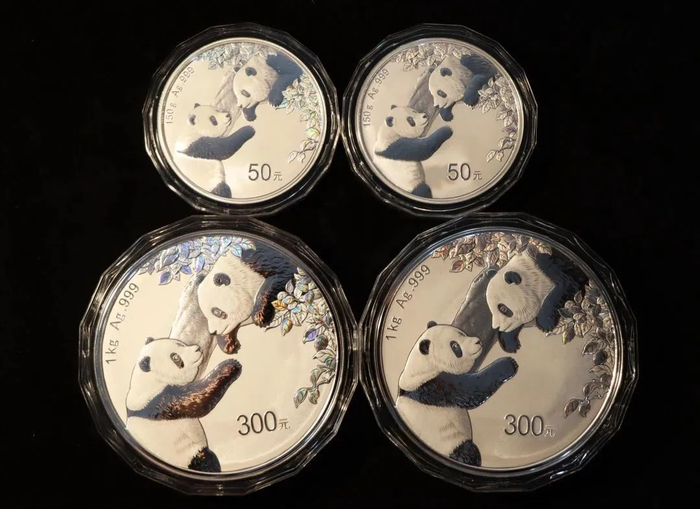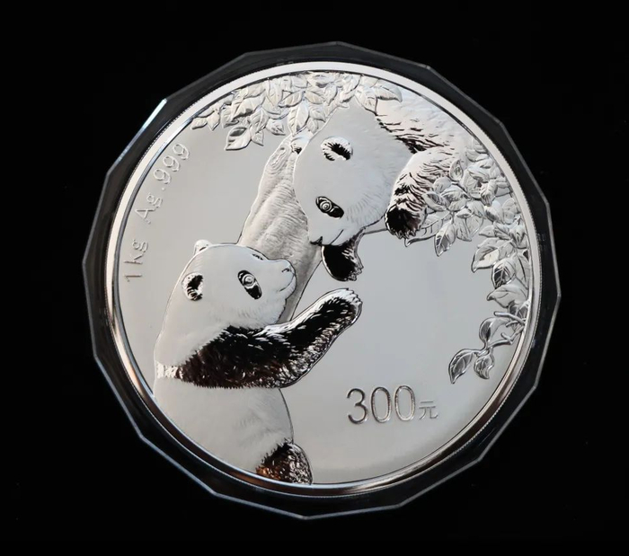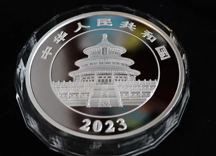 2023版熊猫150克金、银币,1公斤金、银币,这四枚大规格熊猫金银币背面图案中的植物枝叶部分使用了光变鳞彩工艺。今天与大家上手分享的就是其中的150克银币和1公斤银币。