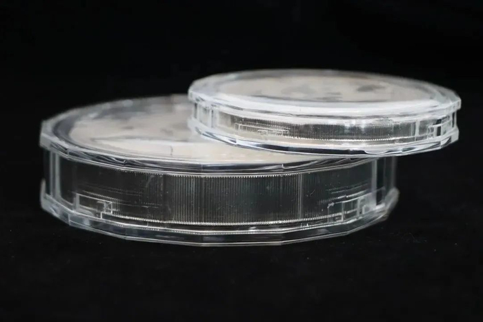 从侧面可以很直观地感受到熊猫1公斤银币和150克银币的厚度差。1公斤银币直径为100毫米,150克银币直径为70毫,当然拿在手上的感觉更是不同,1公斤银币的分量感直接拉满!