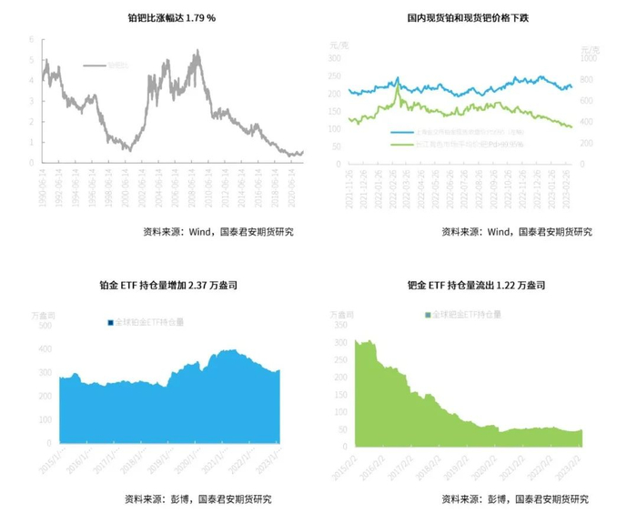 截至2023年3月13日,3月6日当周NYMEX铂金库存与上一周持平,钯金库存与上一周相比小幅流出。在现货升贴水方面,3月6日当周铂金现货贴水转升水又最终贴水,以收盘价来看最终贴水10.2美元/盎司。钯金现货方面,3月6日当周由贴水转升水,最终升水21美元/盎司。在ETF持仓量方面,铂金持续流入,其全球ETF持仓量3月6日当周增加2.37万盎司,而钯金方面扭转上一周流入态势,3月6日当周小幅流出1.22万盎司。