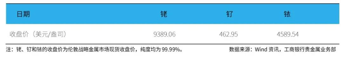 伦敦现货铑(99.99%)收盘价为9689.03美元/盎司,周累计下跌1.52%。