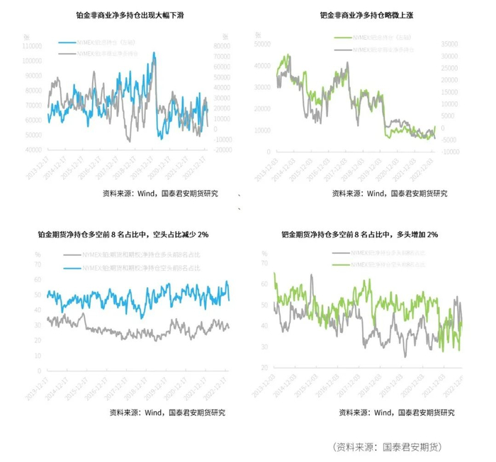 在期货持仓变动方面,截至2023年2月21日,铂金总持仓较上周增加1302张,其中非商业多头方面本周减少502张,非商业空头持仓持续增长,较上周增加2591张,涨幅达11.48%。因此,非商业净多头持仓减少3093张,出现大幅下滑,降幅达52%;在净持仓多空前8名占比上,本周铂金方面净持仓多头占比增加0.4%,空头占比减少2%。钯金方面,截至2023年2月7日,总持仓增加651张,其中非商业多头持仓增加224张,空头增加51张,因而非商业净多持仓增长173张,达4%。在净持仓多空前8名占比上,钯金方面多头减少3%,空头占比持续下滑,本周减少2%。