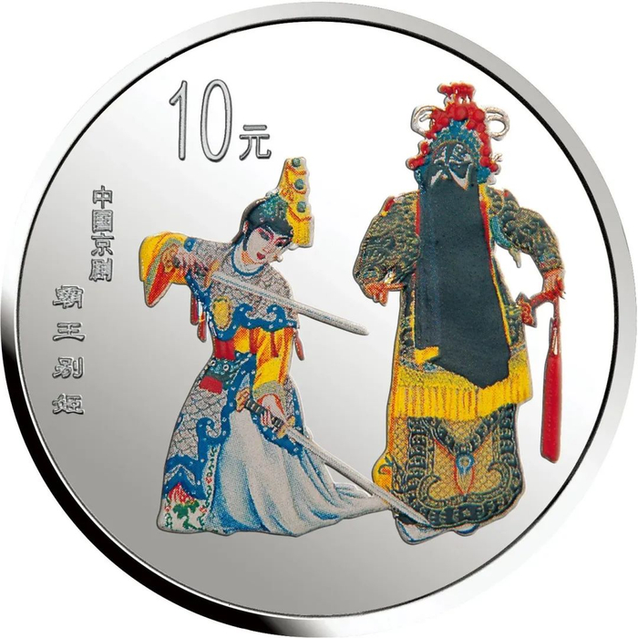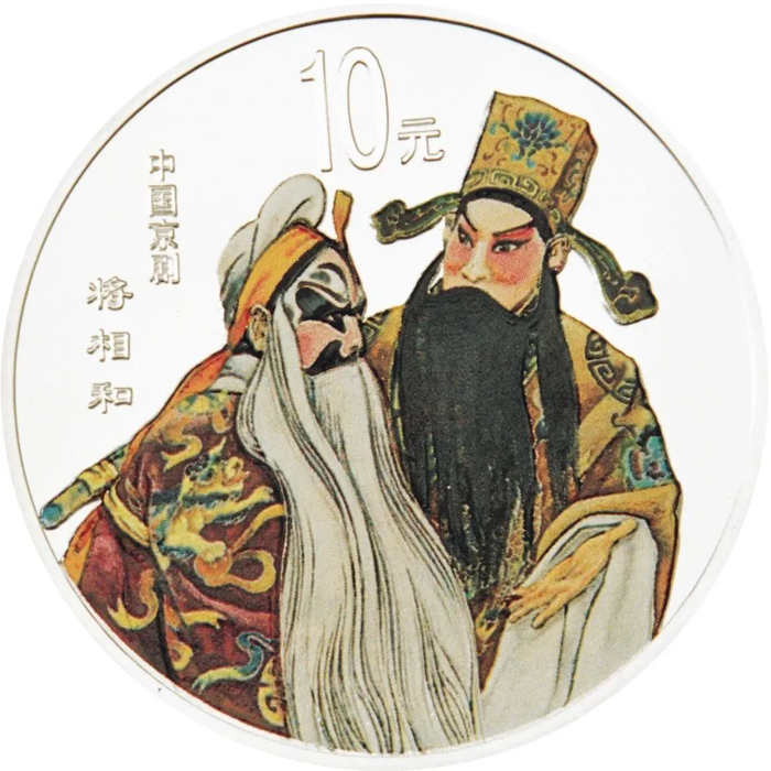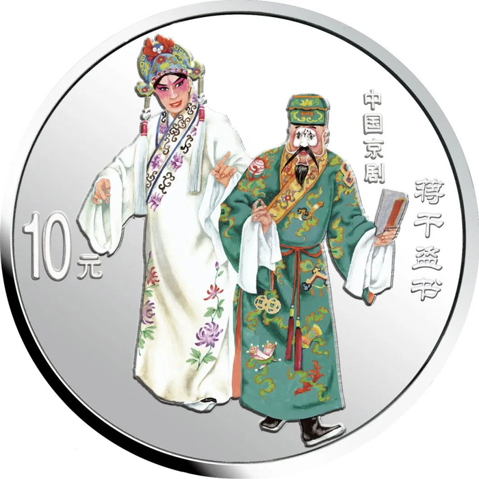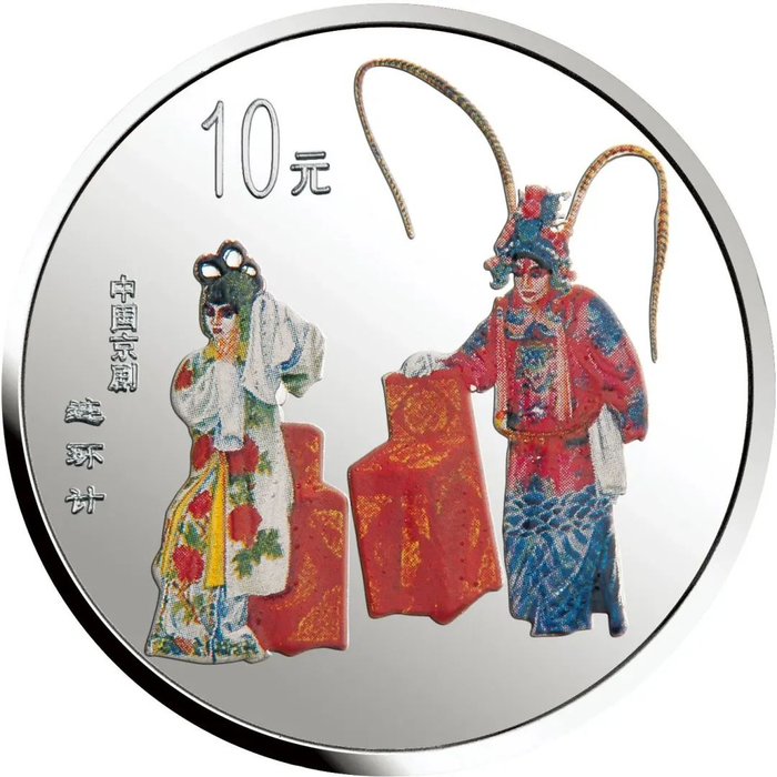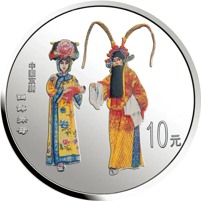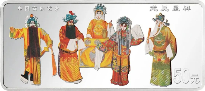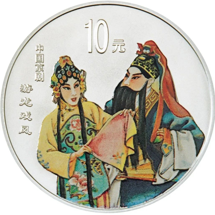 中国人民银行于1999年-2002年,发行了中国京剧艺术彩色金银纪念币(1-4组),每组包括1/2盎司圆形金币一枚,5盎司长方形银币一枚和1盎司圆形银币四枚,共计24个品种,在我国现代贵金属纪念币家族中,是较大规模的系列项目,而且全套金银币均为彩色工艺,生动地再现了经典剧目。