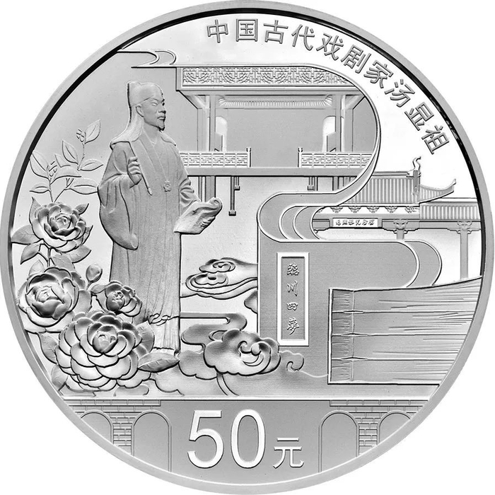 中国古代戏剧家汤显祖150克银币。汤显祖是明代戏曲家、文学家,被誉为“中国戏圣”和“东方莎士比亚”。其戏剧作品《还魂记》、《紫钗记》、《南柯记》、《邯郸记》合称“临川四梦”。其中最著名的就是《牡丹亭》,又名《还魂记》。