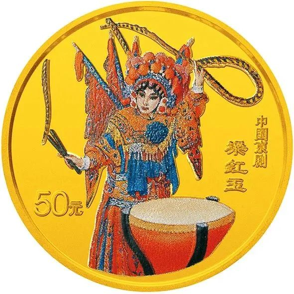该系列四枚金币背面取材分别是:《贵妃醉酒》《梁红玉》《群英会》和《闹天宫》。