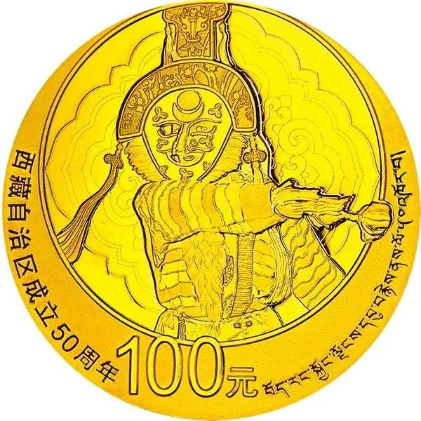 中国人民银行于2015年发行西藏自治区成立50周年金银纪念币,其中1/4盎司金币背面图案为藏戏表演艺术造型。