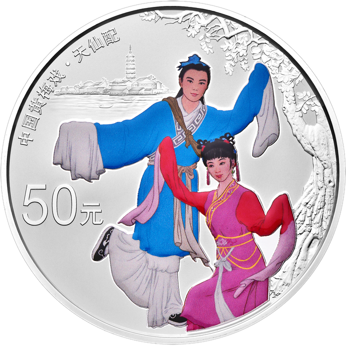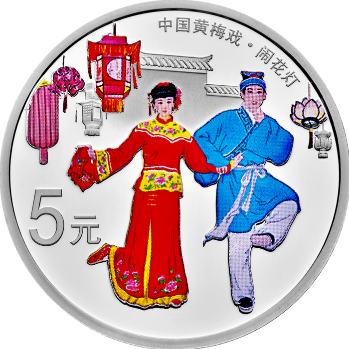 中国人民银行于2017年发行中国戏曲艺术(黄梅戏)金银纪念币。该套纪念币共4枚,包括3克金币、150克银币和两枚15克银币。对应选取的黄梅戏经典剧目为《女驸马》《天仙配》《闹花灯》与《打猪草》。3枚银币采用彩印工艺,人物形象生动。