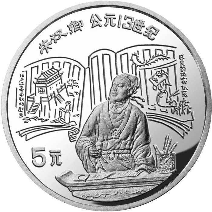 中国杰出历史人物(第6组)关汉卿22克银币。关汉卿是我国戏剧史上作品最多、成就最大的一位作家,位列元曲四大家之首。币面背景选取的是他的两部代表作品《望江亭》和《窦娥冤》。