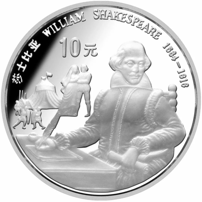 世界文化名人系列(第1组)莎士比亚27克银币。莎士比亚是英国文艺复兴时期伟大的剧作家、诗人,欧洲文艺复兴时期人文主义文学的集大成者。他流传下来的戏剧作品近40部,银币背景选取其代表作《奥赛罗》。