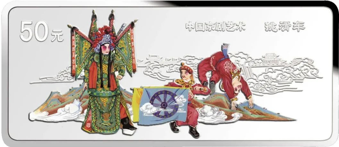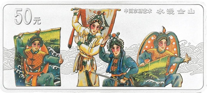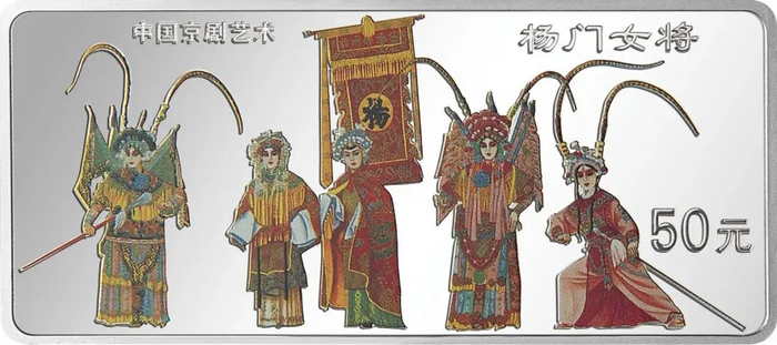 该系列四枚长方形银币背面取材分别是:《杨门女将》《龙凤呈祥》《水漫金山》和《挑滑车》。