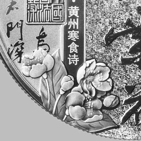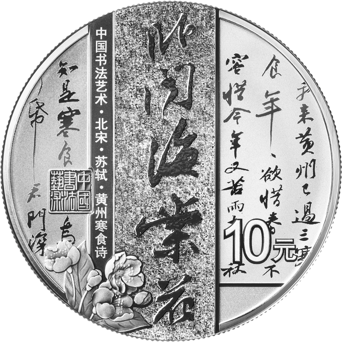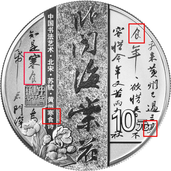 币面还有一处十分巧妙的点,那是图案中出现了三处“寒食”字样,一处是提刊币面主题“黄州寒食诗”中的“寒食”,左右两边还各有一个诗帖中的“寒食”,这三处也正应了苏轼来到黄州三年,耐人寻味。