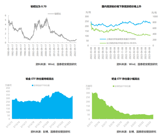 截至2023年6月16日,NYMEX铂金库存与上一周基本持平,钯金库存小幅流出。在现货升贴水方面,铂金现货贴水转升水又最终贴水,以收盘价来看最终贴水0.4美元/盎司。钯金现货方面,由升水转贴水,最终贴水13美元/盎司。在交易型开放式指数基金(ETF)持仓量方面,铂金持续流出,其全球ETF持仓量减少8.1万盎司,钯金方面持续小幅流出0.27万盎司。